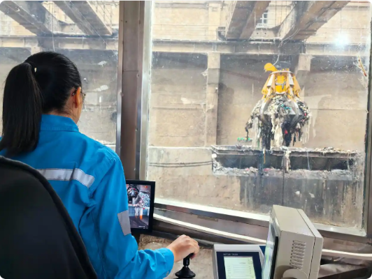 8月15日,在重慶海螺水泥有限責(zé)任公司,工作人員在操作機械臂進(jìn)行垃圾處理作業(yè)。新華社記者 唐奕 攝