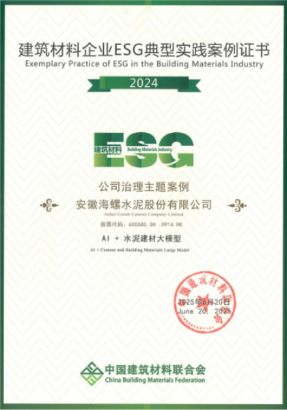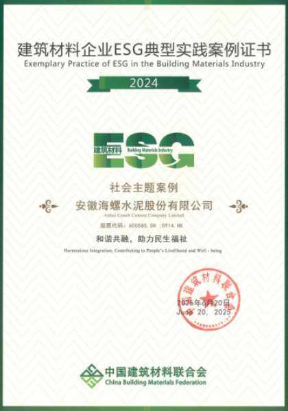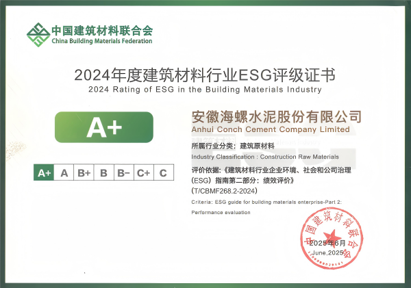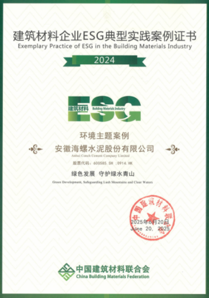 The multiple honors won by Conch Cement this time reflect the high recognition of the building materials industry for the company’s ESG governance and practice, and also demonstrate the benchmark demonstration role of the company in promoting the industry’s low-carbon and green transformation. In the future, Conch Cement will promote the deep integration of ESG concepts with the company’s production and operation, strive to enhance its comprehensive value creation capabilities in environmental, social, and economic aspects, firmly adhere to the path of ecological civilization and enterprise win-win development, transform and enhance the cement industry, cultivate and strengthen green emerging industries, increase the “gold” content of development with the “green” content of the industry, lead the cement industry to forge ahead on the road of green and low-carbon development, and contribute to building a beautiful China.