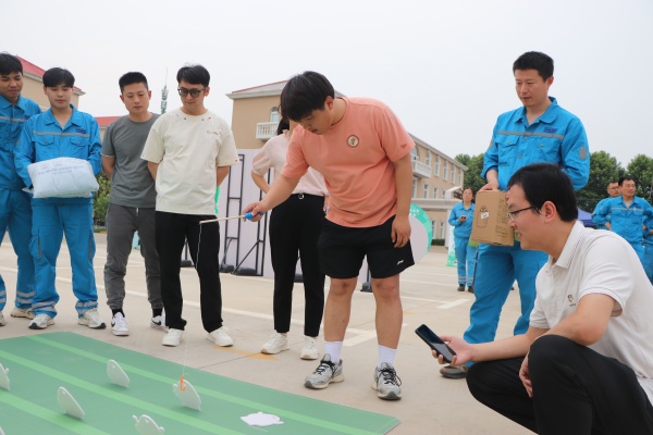 套圈游戲區(qū)排起長隊,員工們手拿套圈躍躍欲試,期待套住心儀的獎品。