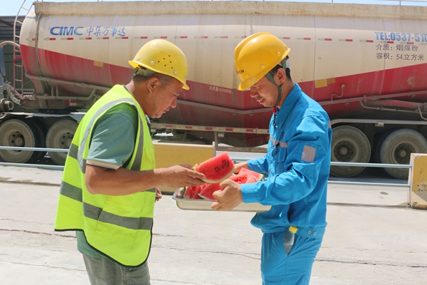 慰問組先后前往窯中廣場、礦山爆破區(qū)、水泥發(fā)運等高溫作業(yè)點,將精心準(zhǔn)備的鹽汽水、綠豆湯、西瓜等防暑降溫物資送到員工手中,確保一線員工在高溫環(huán)境下能夠及時補充水分、預(yù)防中暑。期間公司安全環(huán)保處還現(xiàn)場開展了高溫作業(yè)安全培訓(xùn)、夏季中暑應(yīng)急演練,重點強調(diào)“避開午間高溫時段”“輪換作業(yè)”“穿戴防護裝備”等事項,設(shè)備保全處對生產(chǎn)現(xiàn)場的所有空調(diào)、風(fēng)扇、通風(fēng)設(shè)備進行全面檢修,確保降溫設(shè)施正常運行。辦公室廣泛聽取一線員工對防暑降溫工作的建議,進一步優(yōu)化高溫保障措施,切實保障員工夏季作業(yè)安全。